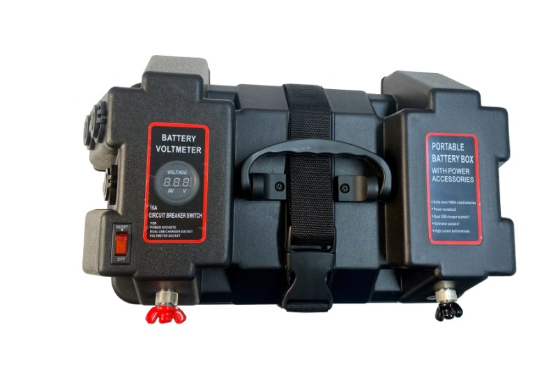 Praktický box pro akumulátory 12V do 100Ah s kabeláží, svorkami a zásuvkami 12V a USB. Do víka lze instalovat menší nabíječku, měnič nebo solární regulátor a tím dále rozšířit možnosti zařízení. Měření napětí baterie integrovaným voltmetrem - zobrazení při zapnutí vypínače s jističem.