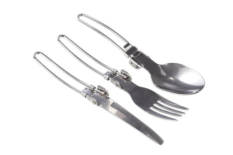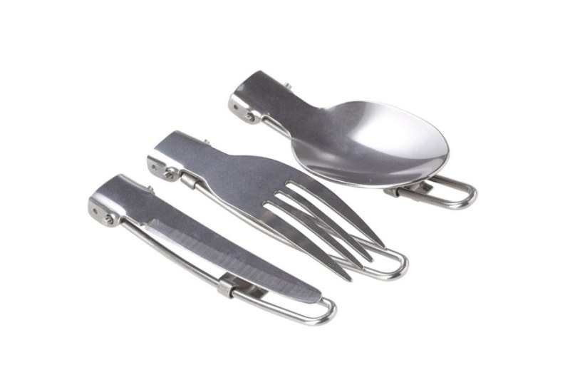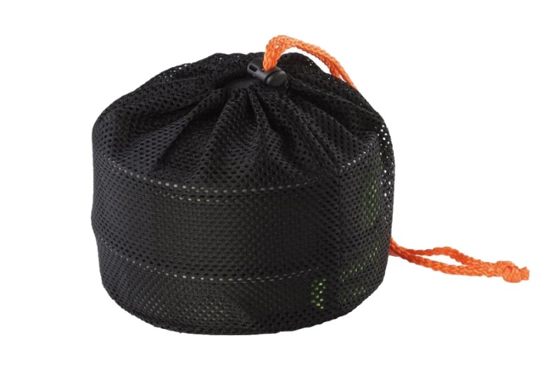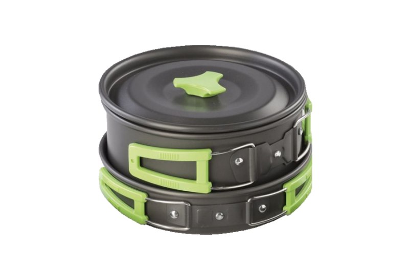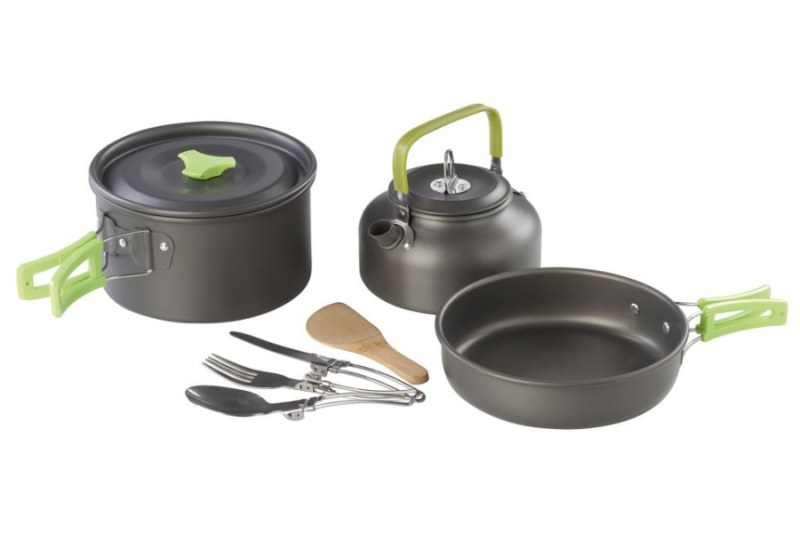 3-dílný set nádobí s eloxovanou povrchovou úpravou, 2 skládací nerezové příbory a dřevěná měchačka. Vše zabaleno v textilním pouzdře.