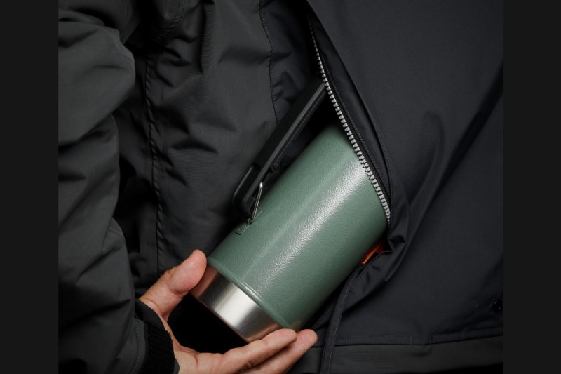 Na zápěstí je podšita tenká vrstva neoprenu „žraločí kůže“ spolu s patentovaným lisovaným uzávěrem na suchý zip Velcro®, který je zárukou pevného uzavření. Pod prohnutím předních kapes naleznete dva navíjecí systémy s kroužkem pro uchycení vašich oblíbených rybářských nástrojů. Obsahem bundy je také jeden magnetický systém o nosnosti 1,6kg.
